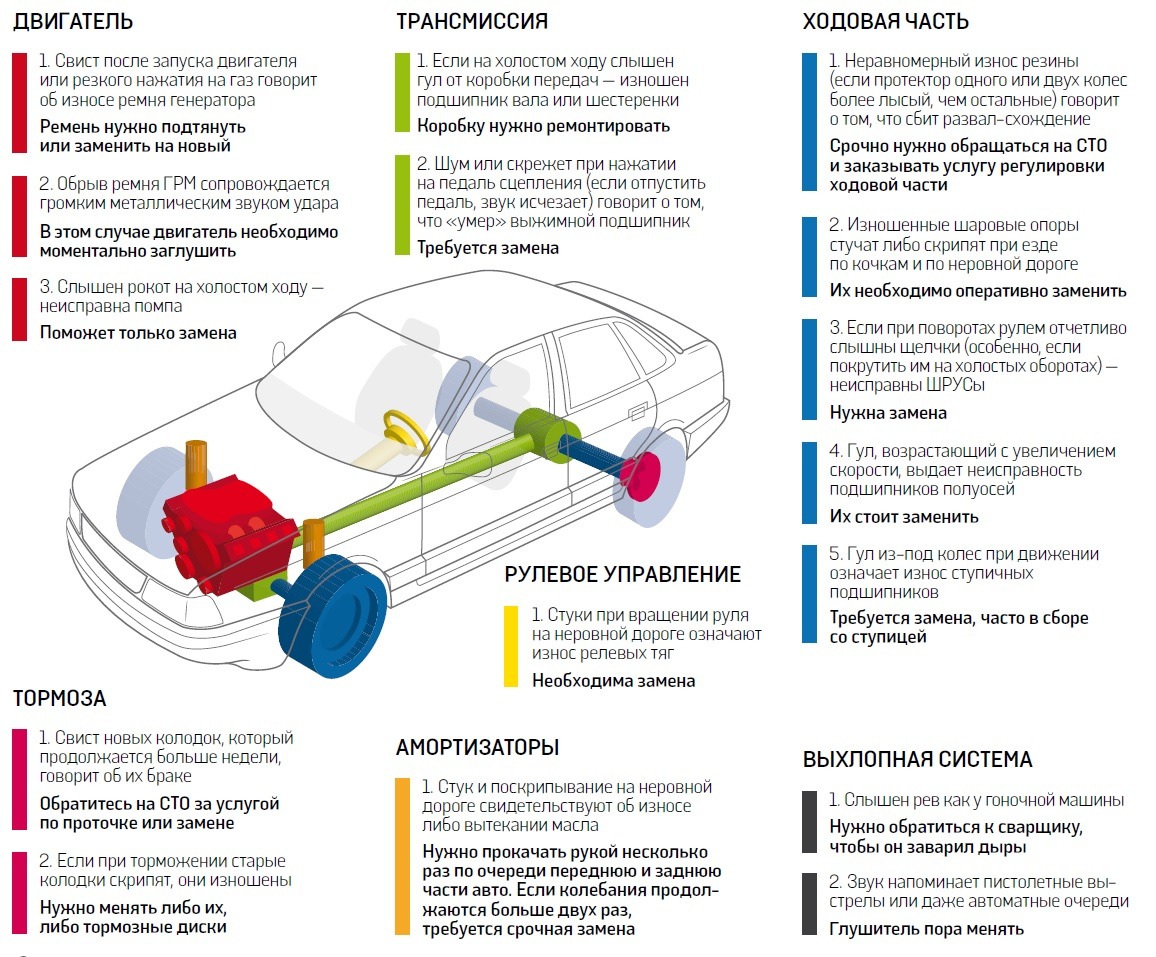 Какие шумы говорят о скорой поломке автомобиля. Начнем с того, что ни на холостом ходу, ни при движении не должно быть ни стуков, ни грюков, ни визгов — любой звук такого рода должен заставить водителя насторожиться. Особенно, если он не прекращается на протяжении нескольких часов. Отметим, что длительная езда с неприятным звуком часто приводит к тому, что водитель перестает его замечать (воспринимает как норму). Результат — поломка автомобиля прямо посреди дороги. И на СТО приходится ехать все равно, но только уже не своим ходом, а на эвакуаторе, услуги которого обходятся в сотни и даже тысячи гривен (в зависимости от расстояния). Мы узнали, в каких случаях нужно и прислушаться, и присмотреться к своему авто. ДЛЯ ПРОВЕРКИ МОТОРА НУЖЕН СТЕТОСКОППростой способ проверить состояние двигателя, не разбирая его, — прослушка с помощью медицинского стетоскопа, который можно купить в аптеке за 60–100 грн. Его нужно прикладывать к двигателю и просить помощника резко нажимать на педаль газа. Коренные подшипники коленвала в случае неисправности издают металлический глухой звук, а его частота увеличивается с добавлением газа. Резкий металлический звук и с неравномерными промежутками вызывает чрезмерный осевой зазор коленвала. А если в моторе визг, скорее всего, виноваты шатунные подшипники. Кривые поршни издают приглушенный стук, а если он слышен с равномерными интервалами, нужна срочная регулировка клапанов. | |